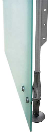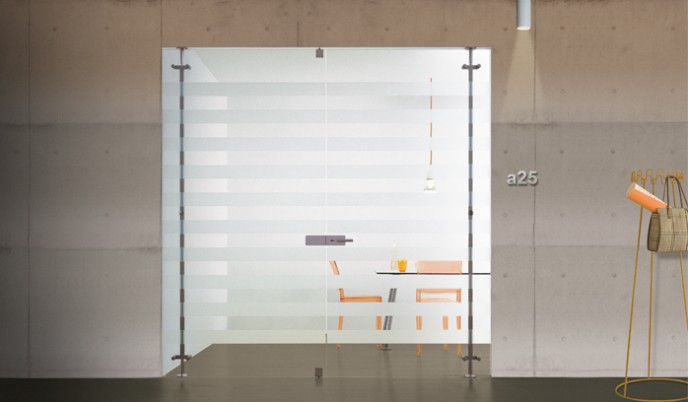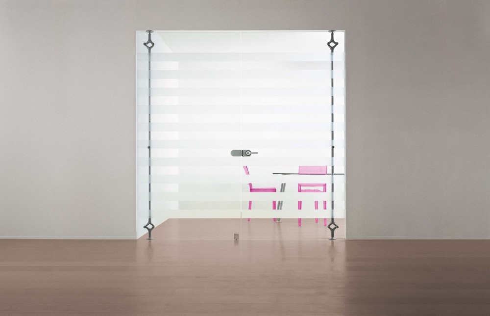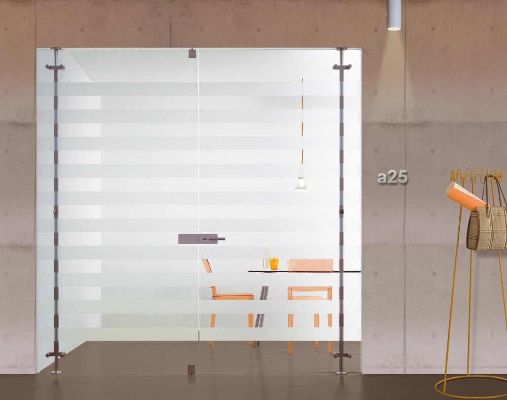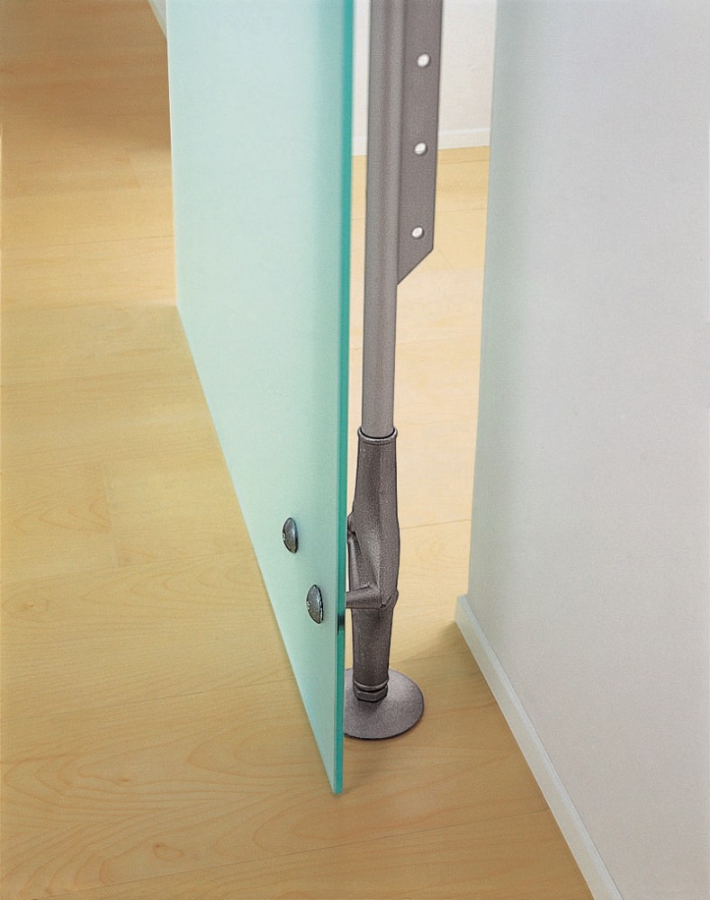 Hardglazen deur draaiend aan een aluminium staander die wordt geklemd tussen vloer en plafond.