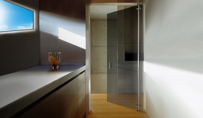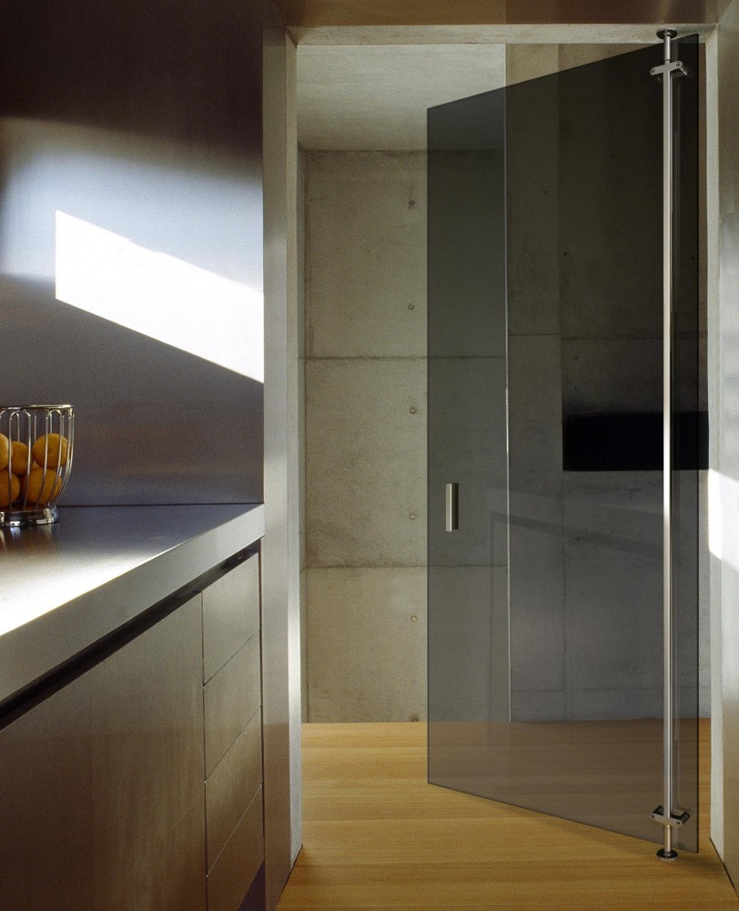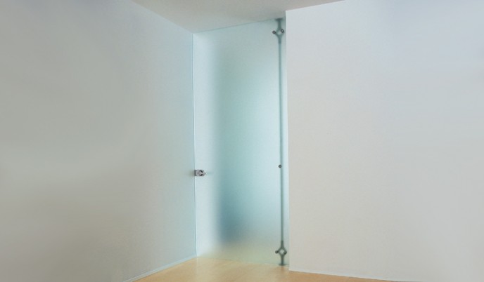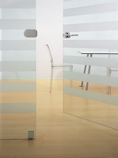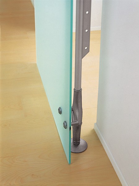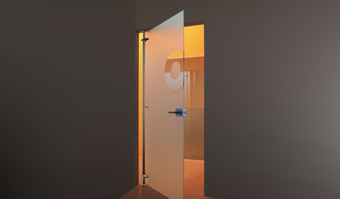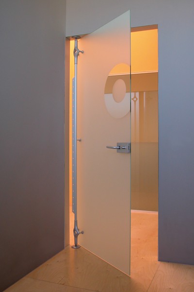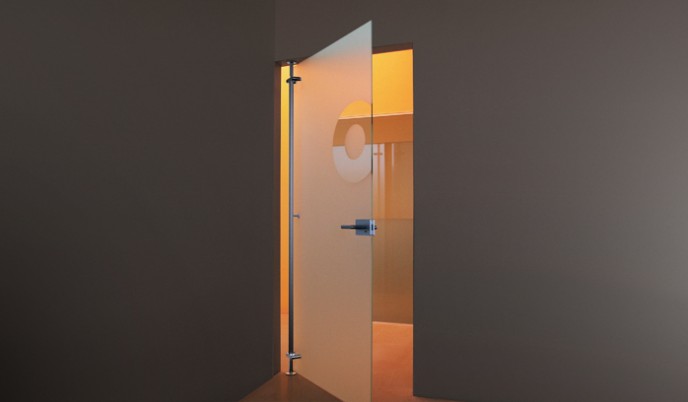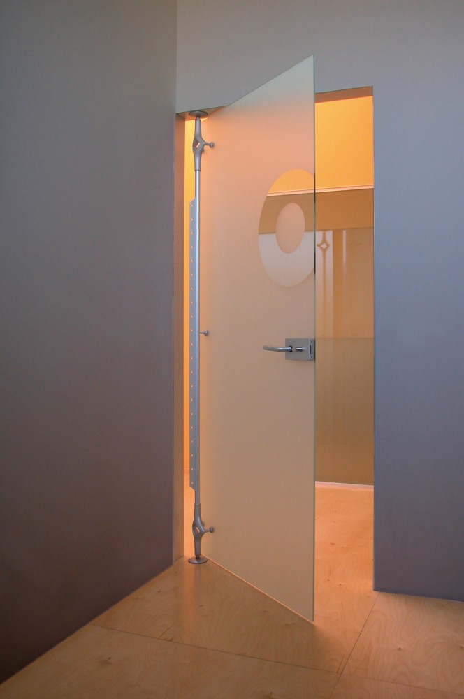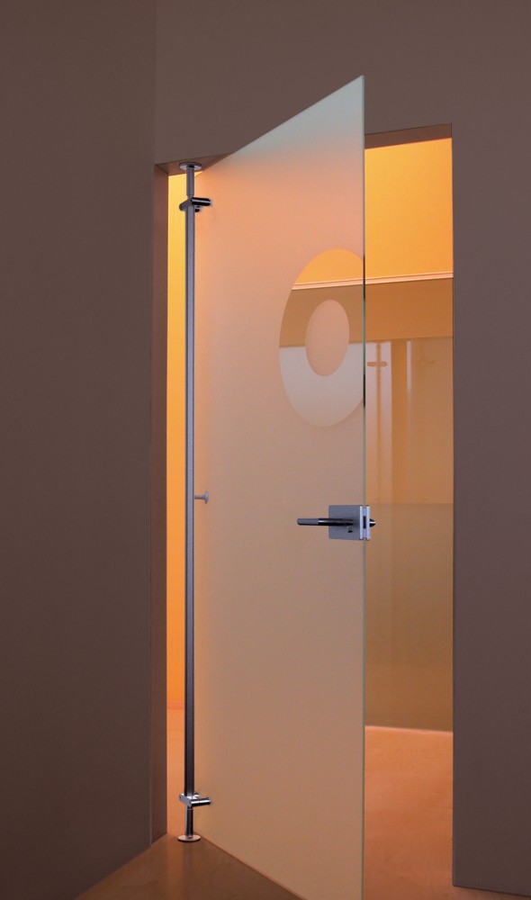 De deurstaander is volledig op het glas gemonteerd en draait om zijn as. De deur draait open naar de staander zijde. Het is door toepassing van een vloerpot mogelijk om de deur 180 naar twee kanten te laten draaien. De vloerinbouwdiepte is 55mm. N.B. niet zonder meer toepasbaar met vloerverwarming.